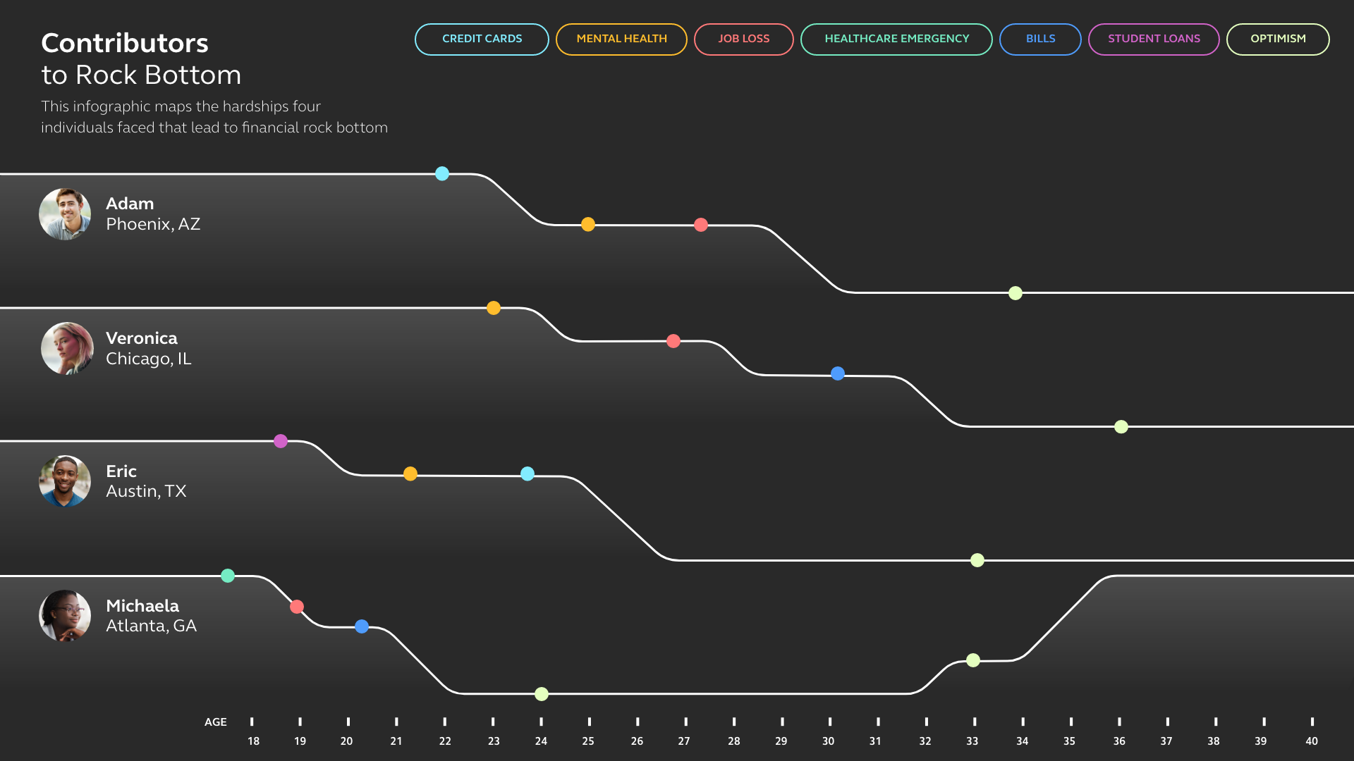 I knew I wanted this infographic to be more than just a static one pager, but something that someone could interact with to gain information. Using my knowledge of the prototyping capabilities in Adobe XD I put together a timeline dashboard which categorizes the common financial hardships and when they happened to each individual.