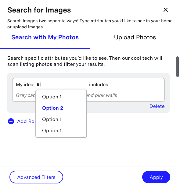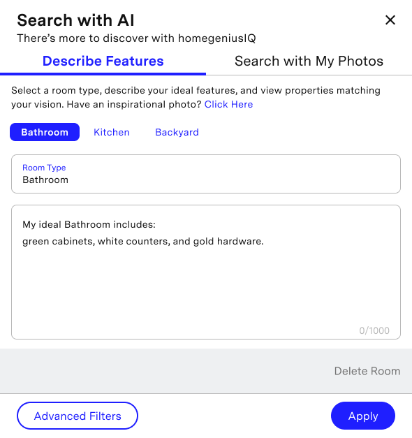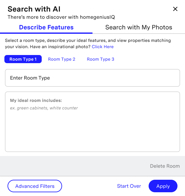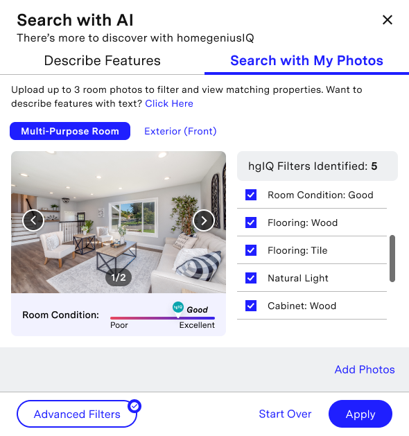Integrated the "Describe Features" tool into the existing "Search with Photo" modal, organized by tabs to allow users to choose either option. Since this tool analyzes property photos—unlike the core filters such as bed, bath, and price—it made sense to house both features within a unified interface.